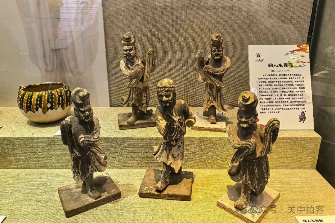 公元581年至960年,隋唐时期,空前繁荣。当时,焦作地区分属于河北道河内郡和河南府河南郡,地处东都洛阳北通山西和河北的咽喉要道,也是华北通往长安的枢纽,战略位置十分重要,成为兵家必争之地。这里陈列的五件胡人木舞俑是唐代木雕珍品,再现了胡腾舞的精彩瞬间,寓动于静,呼之欲出。中间的木俑头戴圆帽,身穿汉袍,似在独舞;其他四件木俑头戴螺旋尖顶帽,身穿胡服,成组对舞。