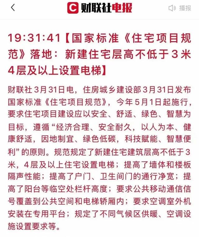 住宅层高不低于3米、每个住宅单元至少设置1台电梯、提高墙体和楼板隔声性能...