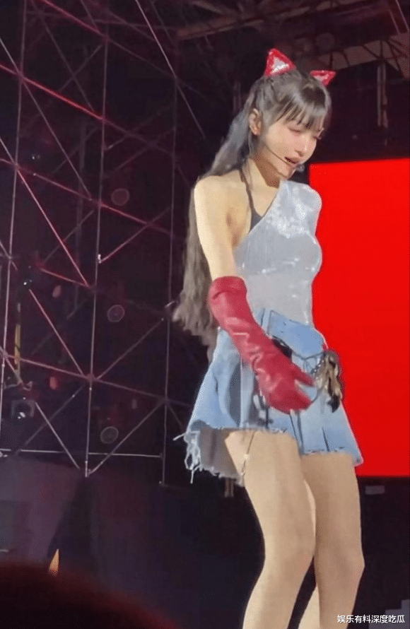当夜幕低垂,舞台灯光逐渐汇聚成一束束耀眼的光芒,谢金燕身着闪亮银色吊带裙搭配牛仔短裙,如同一道划破夜空的流星,瞬间吸引了所有人的目光。她的装扮既保留了少女的俏皮与灵动,又不失成熟女性的韵味与风情。红色耳朵装饰和红色皮手套的点缀,更是为她的整体造型增添了几分不羁与热情,仿佛是从复古与现代交织的梦境中走出的精灵,每一个细节都透露着精心设计的巧思与对舞台的无限热爱。