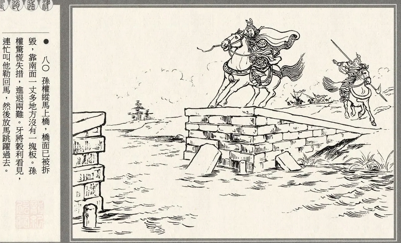合肥之战,张辽威震逍遥津,大败吴军。孙权想从小师桥逃回南岸,没想到张辽事先已经派人把桥拆掉一半。眼看后面追兵已到,孙权惊慌失措,无计可施,正在这危机时刻,牙将谷利大喊到:“主公可先退后,再放马向前,跳过桥去。”孙权依言而行,战马竟然真的跳过河去,带他脱离了险地。