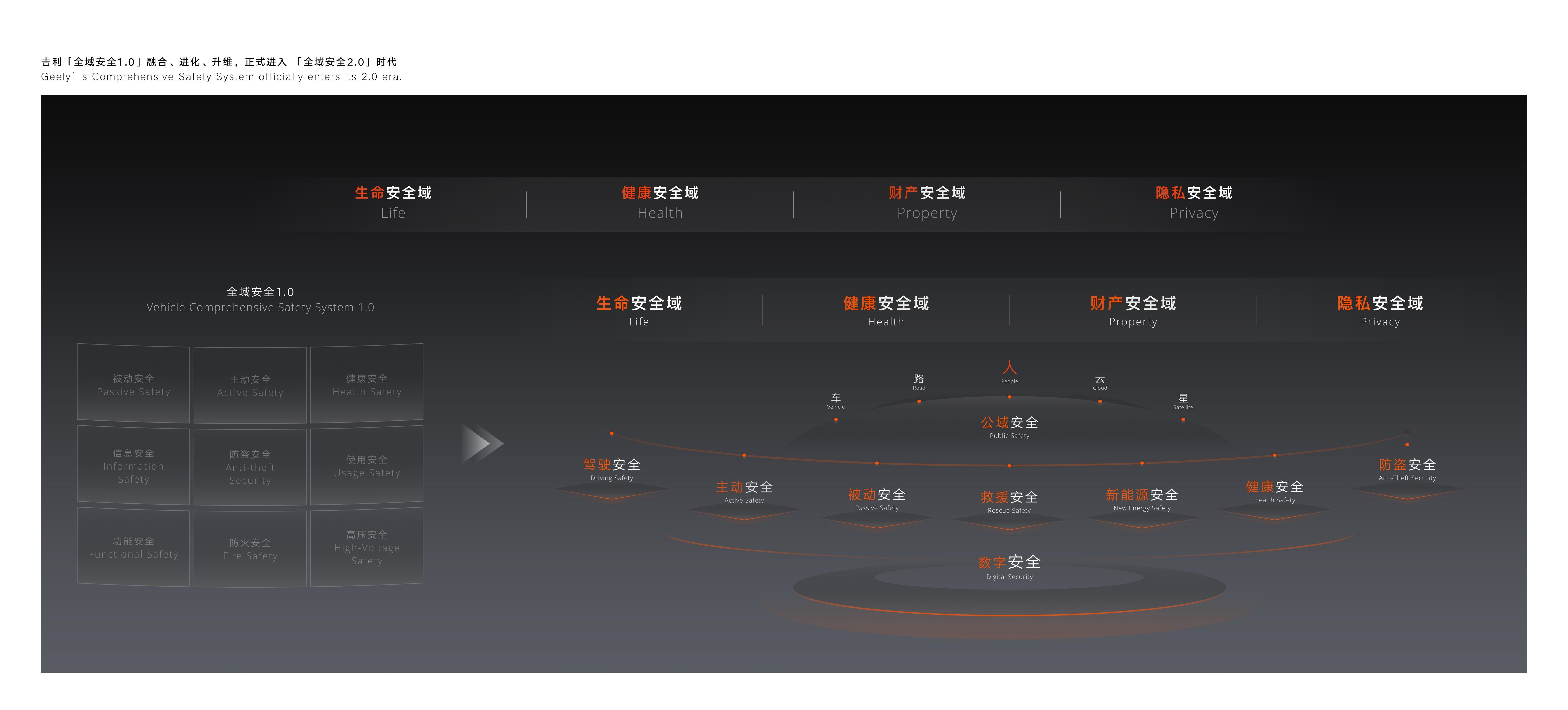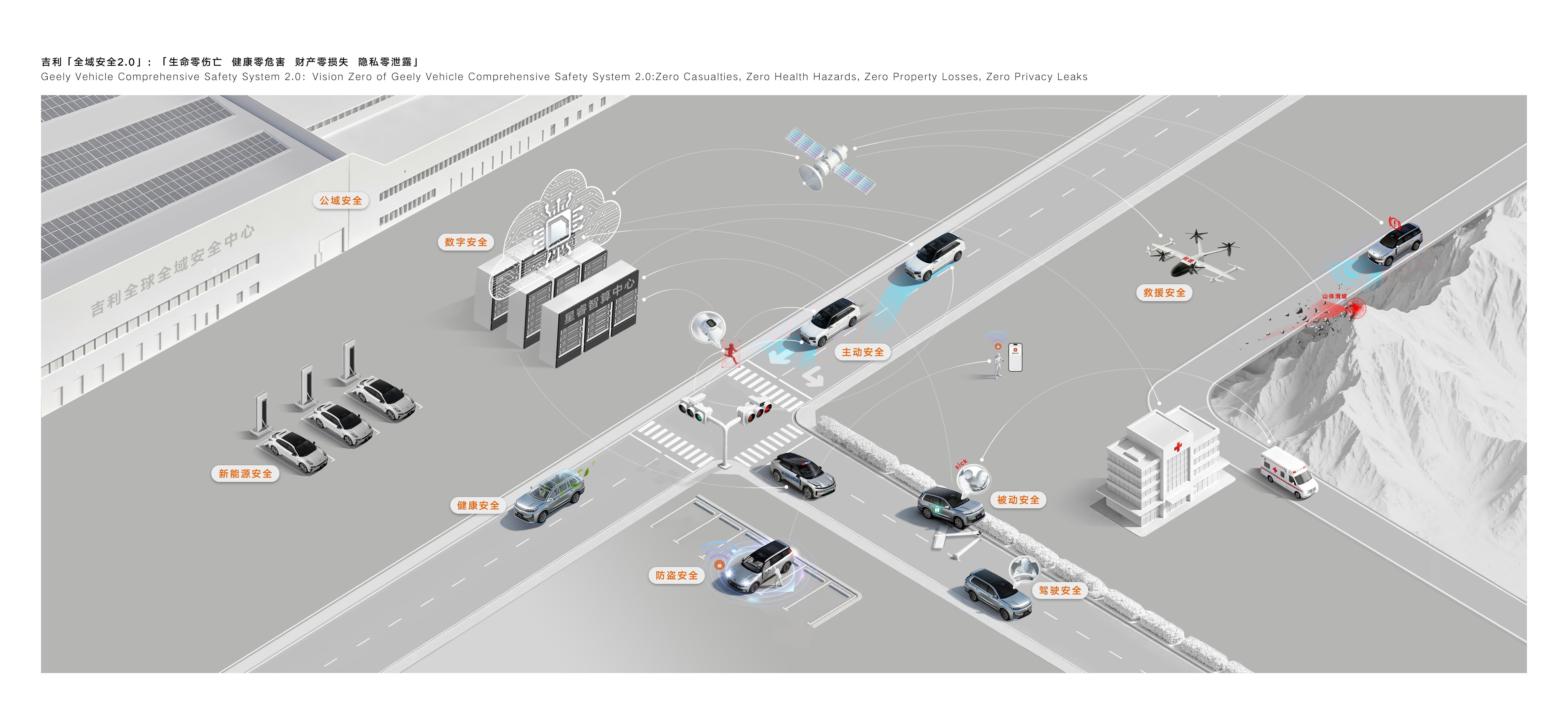 作为行业安全技术的先行者与引领者,吉利在“全域AI”技术体系的赋能下,以“AI为纲 责任为本”,基于原有的“全域安全”技术体系进阶打造“全域安全2.0”技术体系。结合智能时代的安全新需求和新挑战,“全域安全2.0”技术体系秉持“以人为尊”理念,通过技术升级、能力突破与范式创新,将侧重“整车安全”的视角升级为“人-车-路-云-星”的生态视角,旨在贯穿用户出行全场景、覆盖出行全领域、联动出行全生态;并以“生命零伤亡、健康零危害、财产零损失、隐私零泄露”四大安全愿景为指引,逐步构建的一套为消费者提供全面的安全保障技术体系。