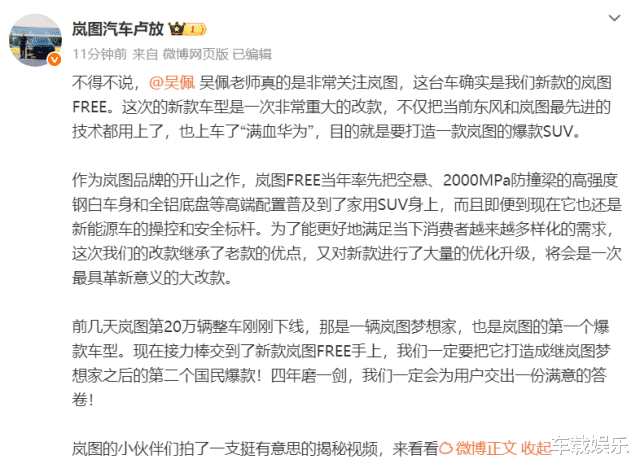 4 月 11 日,岚图汽车 CEO 卢放在微博上发布重要消息,官宣网络上热议的一款伪装车正是即将发布的新款岚图 FREE,并证实了网友猜想,新车将搭载“满血华为”。卢放在博文中强调,此次改款的新款岚图FREE将是一次非常重大的改款,预计在华为赋能之外,还将融合东风和岚图的最新技术,旨在打造继岚图梦想家之后的第二款爆品。