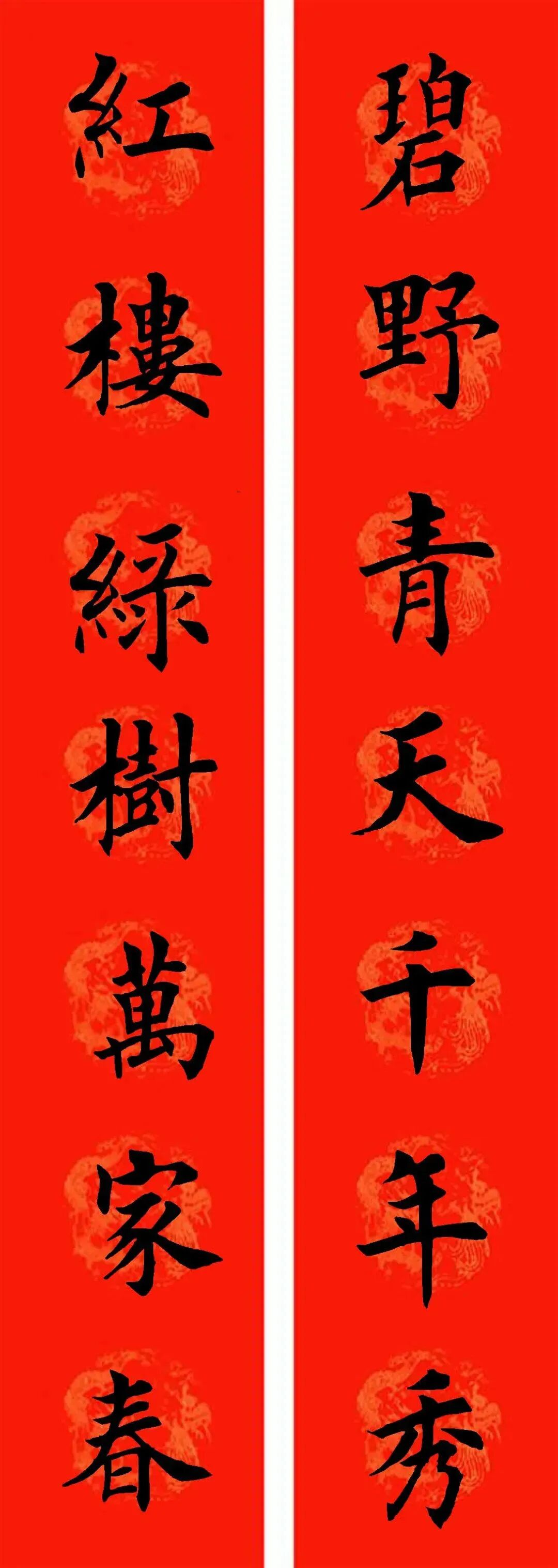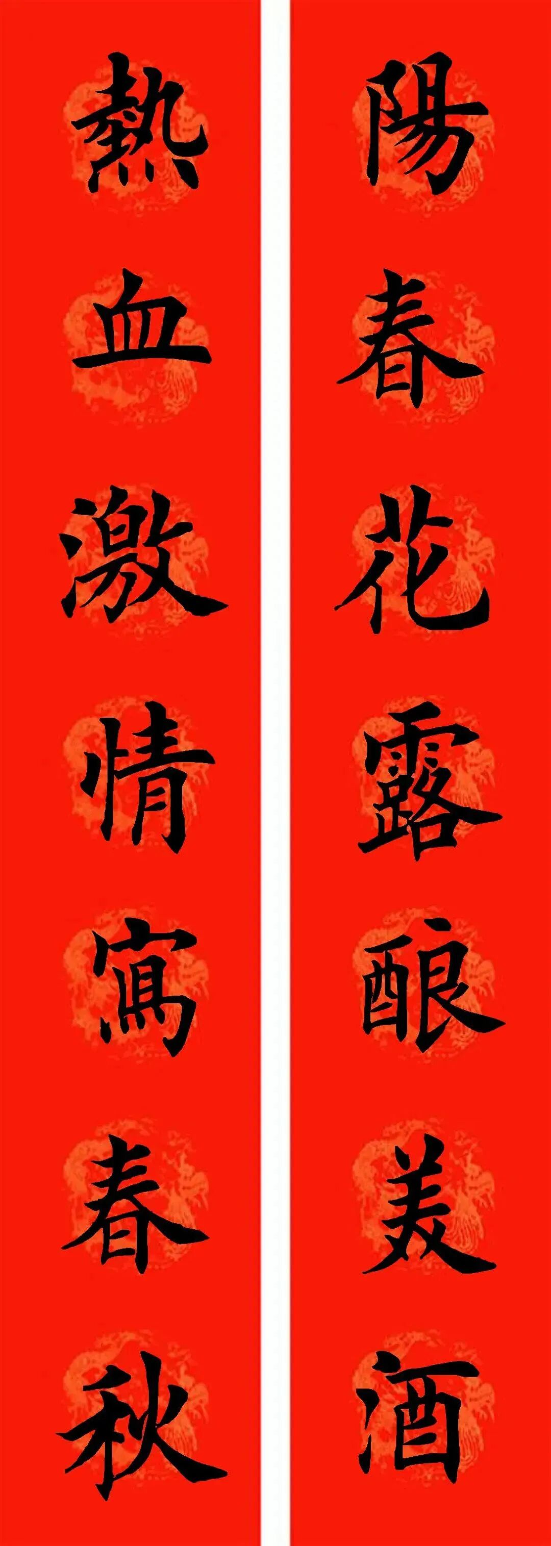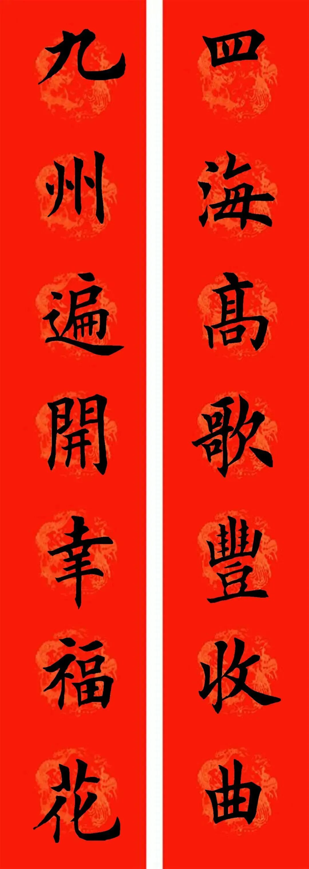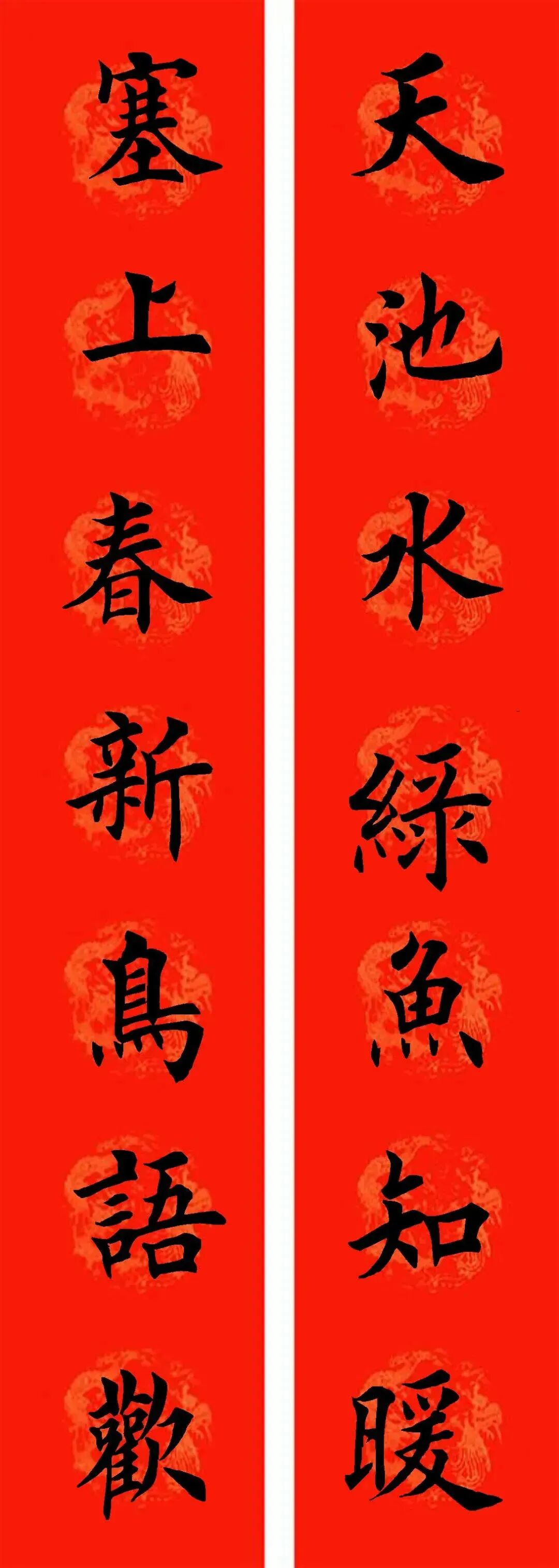 田英章被誉为“田楷”开创者,其楷书春联以“端庄俊美、严谨工整”著称:点画精到、横竖撇捺皆合欧体法度;结构方正平稳,字距行距疏密得宜;布局多取“顶天立地”或留边式,横批与上下联形成秩序之美,兼具印刷般的规整与手写温度,被书友誉为“当代春联顶流”