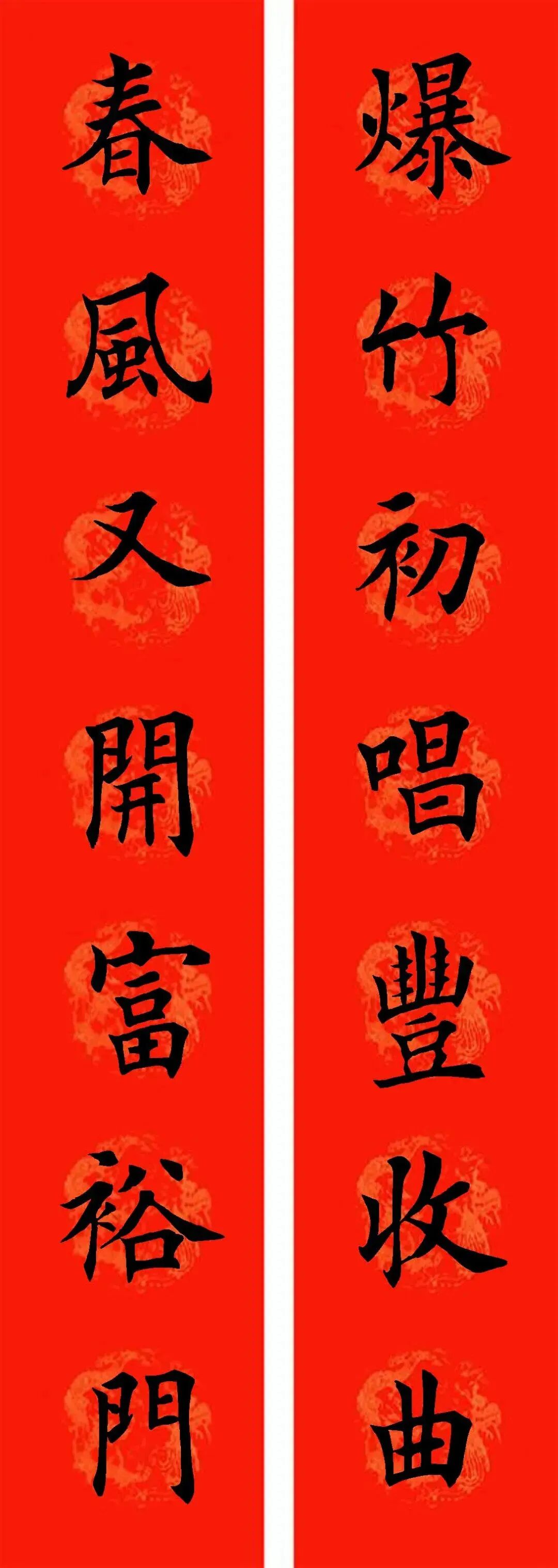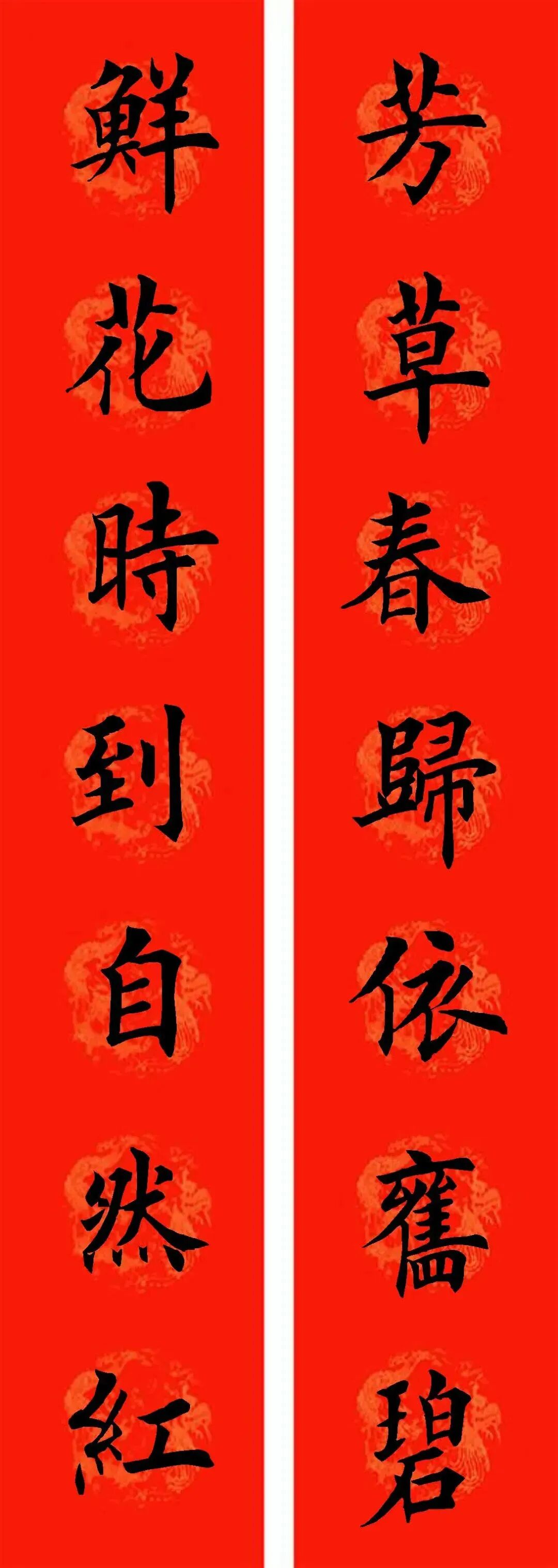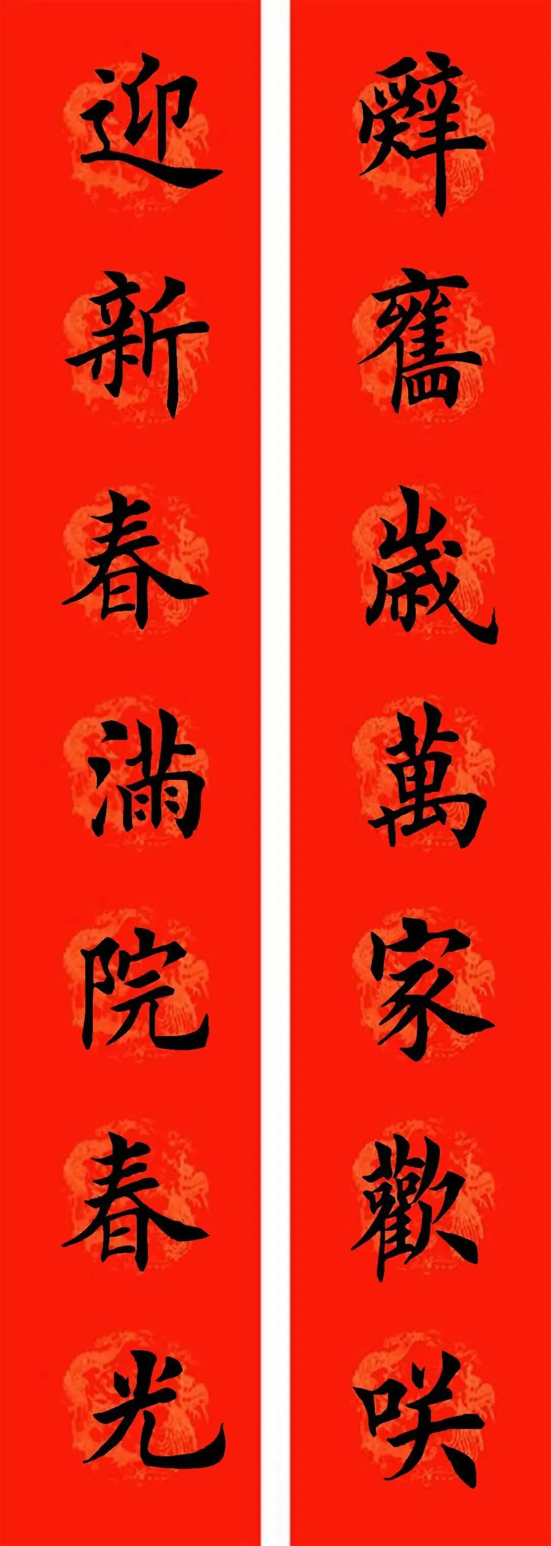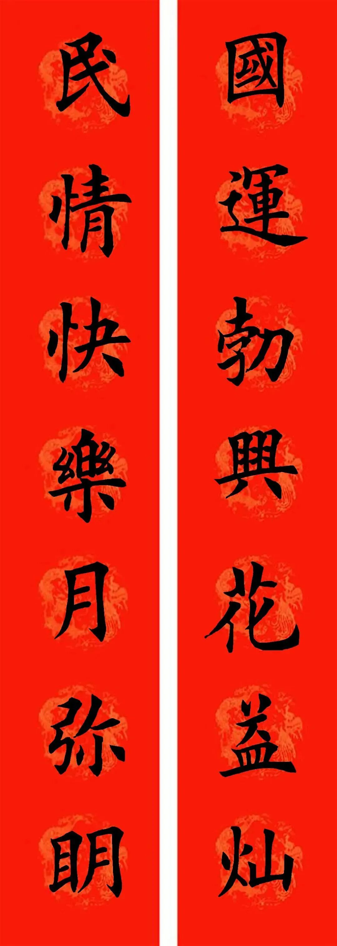 田英章被誉为“田楷”开创者,其楷书春联以“端庄俊美、严谨工整”著称:点画精到、横竖撇捺皆合欧体法度;结构方正平稳,字距行距疏密得宜;布局多取“顶天立地”或留边式,横批与上下联形成秩序之美,兼具印刷般的规整与手写温度,被书友誉为“当代春联顶流”