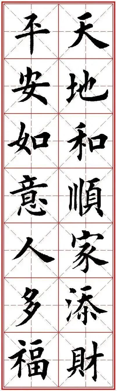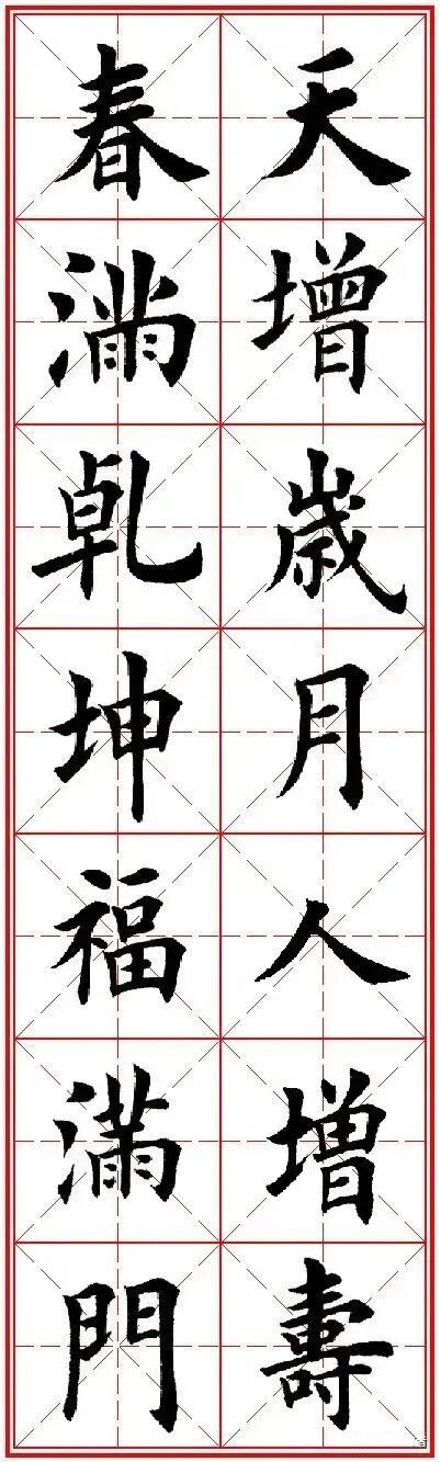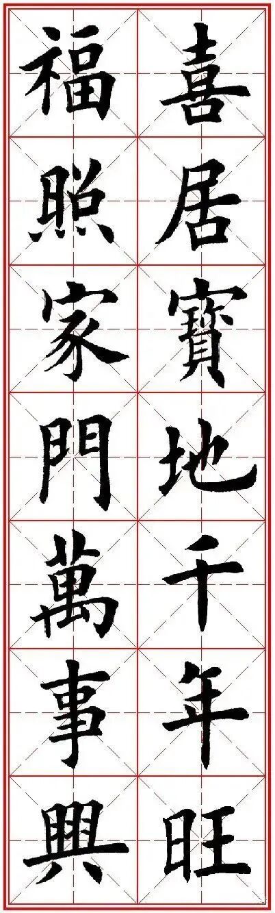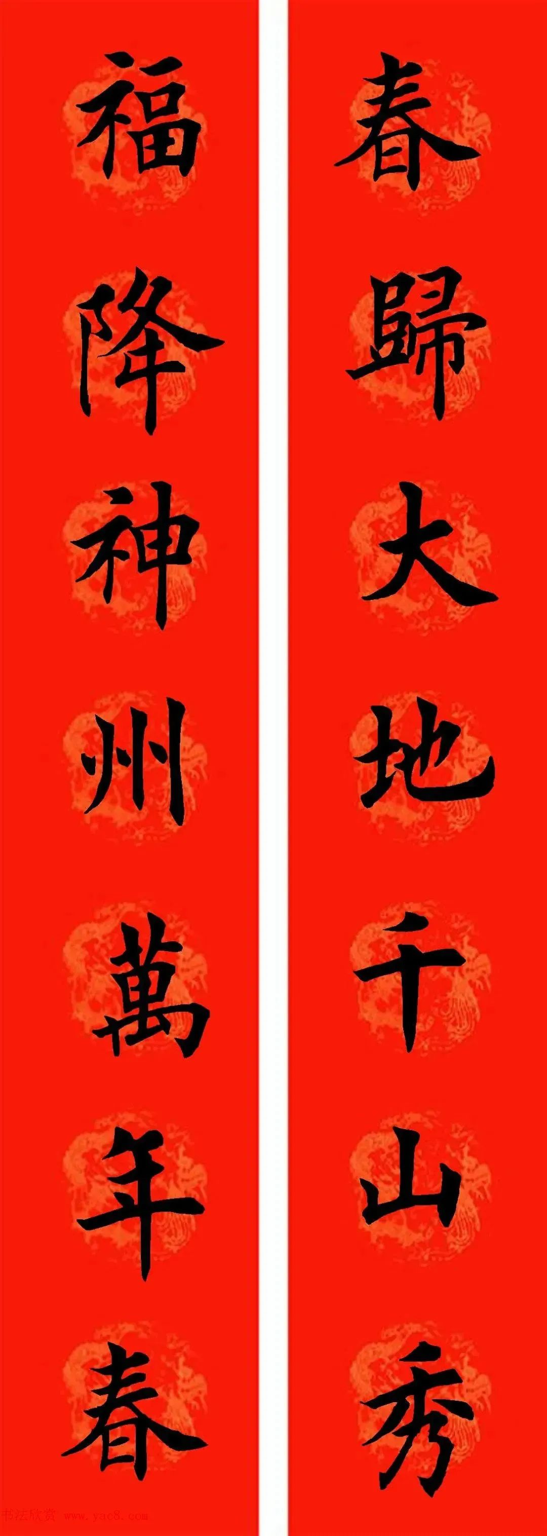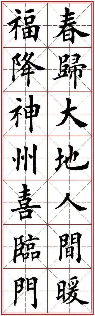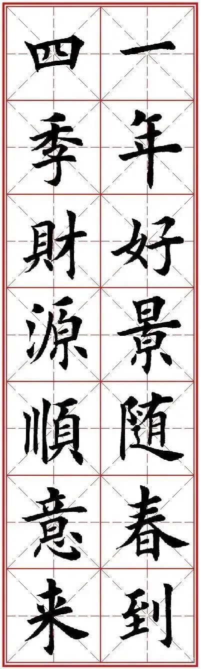 田英章被誉为“田楷”开创者,其楷书春联以“端庄俊美、严谨工整”著称:点画精到、横竖撇捺皆合欧体法度;结构方正平稳,字距行距疏密得宜;布局多取“顶天立地”或留边式,横批与上下联形成秩序之美,兼具印刷般的规整与手写温度,被书友誉为“当代春联顶流”