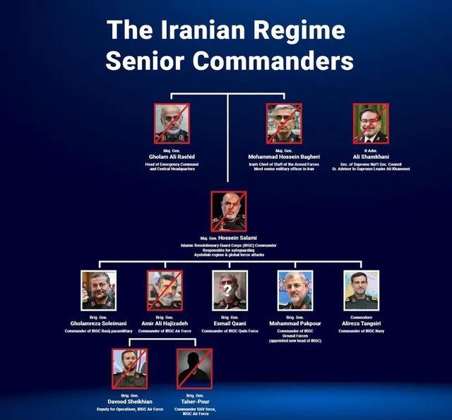 第一轮行动就敲掉了伊朗武装部队总参谋长、革命卫队司令、革命卫队航天部队司令、联合作战司令部司令等高级将领,结果不出意外,革命卫队组织导弹进攻的指挥链被迅速打断。