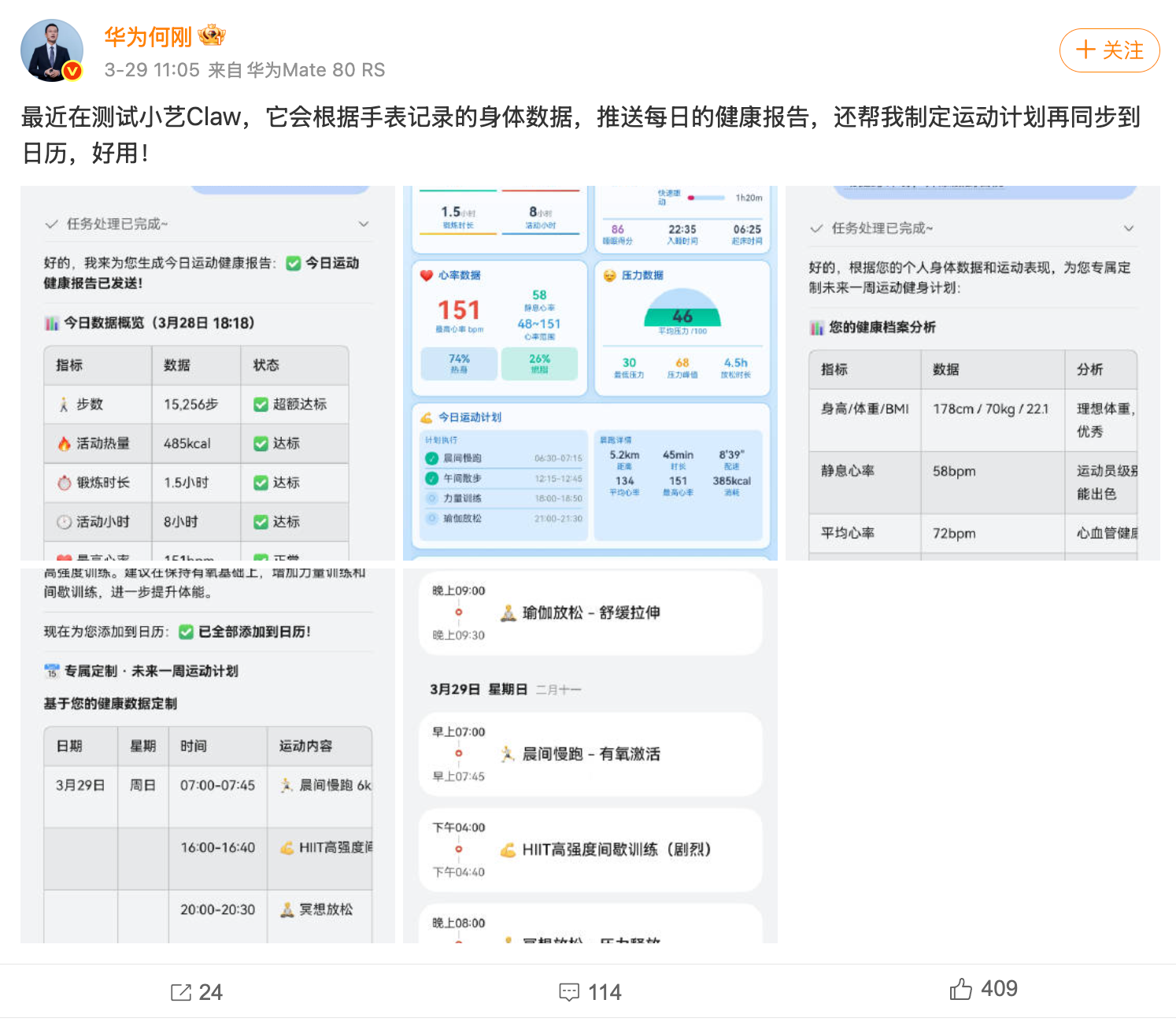 另外,小艺Claw还可以直接调用鸿蒙系统里的自有应用,像建日程、定闹钟、发短信等等统统不在话下;更绝的是,TA能打通鸿蒙多终端设备的相关数据,像何刚总已经让小艺Claw基于华为手表的监测数据提供定制运动计划并直接同步进日历之中,比单纯的提供运动建议的AI助手方便很多有没有!