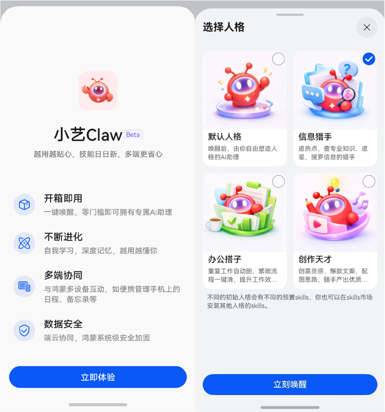 小艺Claw提供“默认人格、信息猎手、办公搭子和创作天才”四种初始人格,每种人格都预制了多种技能,大家可以根据自己的需求选择开启属于自己的“龙虾养成之旅”。