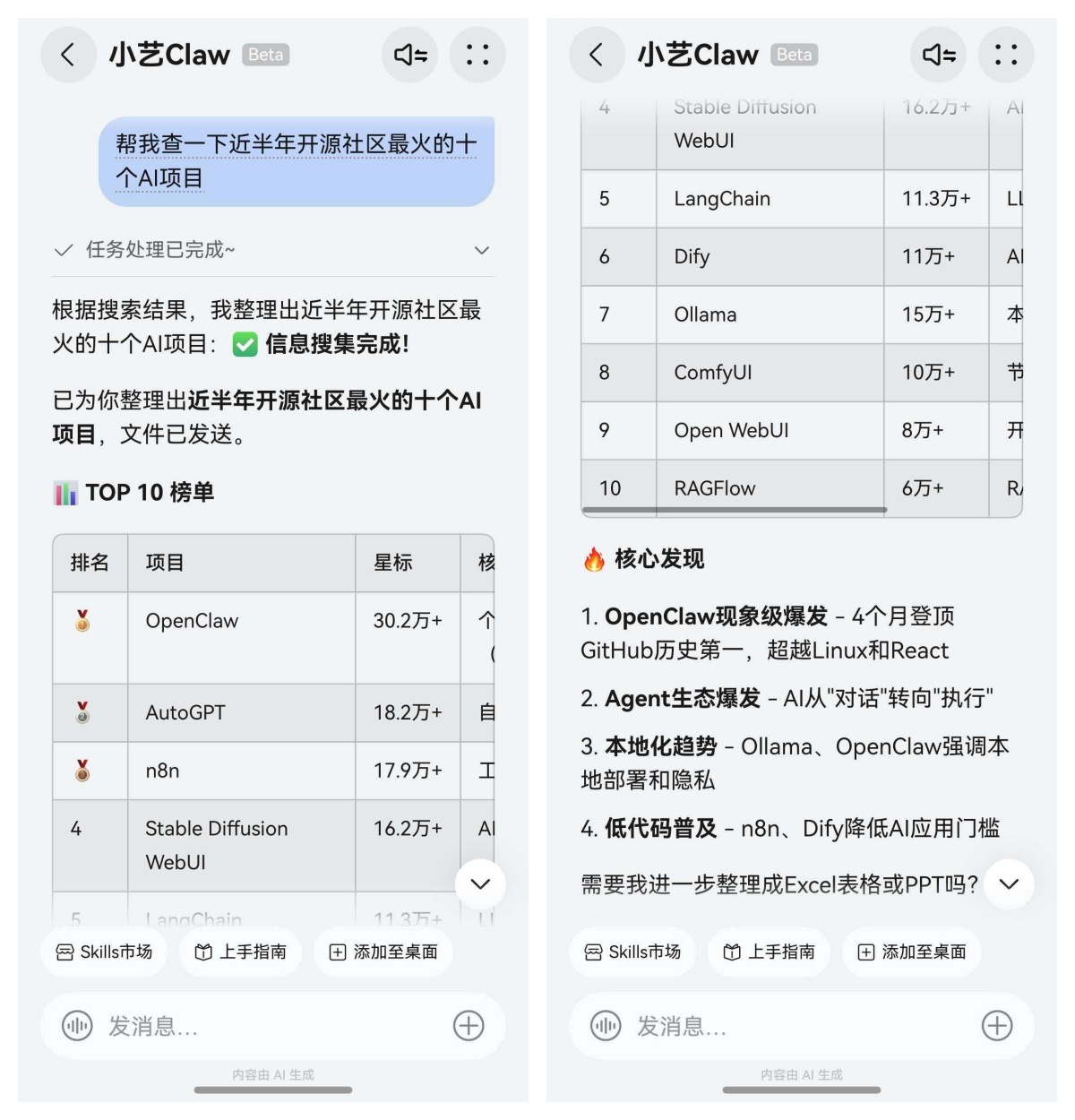 作为一名科技爱好者,我自然最关注行业动态。小艺Claw的“信息猎手”人格正是搜集信息的好帮手。只需一句“帮我查一下近半年开源社区最火的十个AI项目”,TA就把项目名称、定位、适用人群列得清清楚楚,比我自己徒手搜快多了。