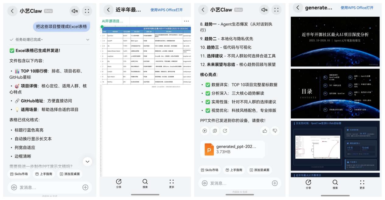 但真正让我惊喜的是TA的闭环服务能力——这份信息还可以变成可编辑的Excel文件!我接着说了句 “把这些项目整理成Excel表格”,小艺Claw就自动生成了结构化的表格文件,甚至还能进一步说“帮我基于这些数据做一个分析PPT”,整个工作流从信息搜集到最终交付,一气呵成,省时省力!