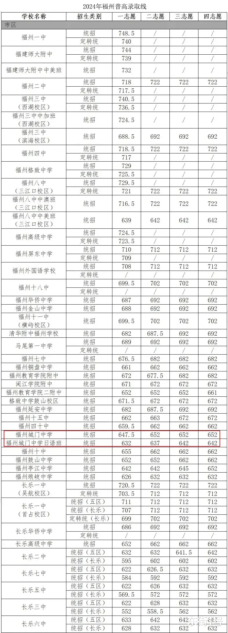 虽然是区属百年老校,虽然2020年成为福州外国语教育集团的核心成员校,但依然是福州“垫底村中”。2024年,福州城门中学中考统招录取分数线是647.5分,是四区最低分普高,日语班门槛更低。