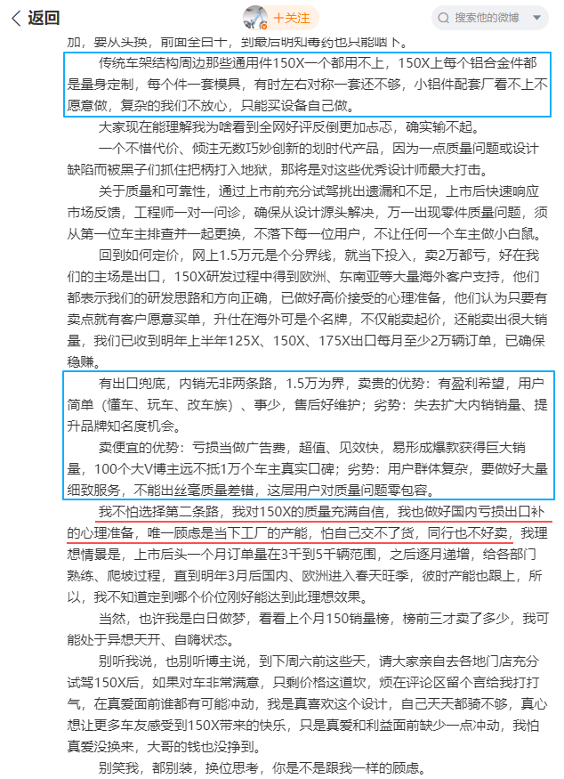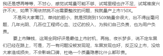 以上是本次陶老板的微博自述的部分截图,根据内容的主要意思小编总结最重要的两点意思就是:一、上市还不是时候,试驾里程数也不够,下周再挑不出毛病就上市(言外之意就是150X下周上市,但是否下周上市还得看有没有别的问题出现)。