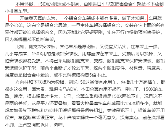 毋庸置疑150X所搭载的铝合金车架在同级中是唯一的存在,成本肯定比普通钢管车架要贵这也无可厚非。但是一台150X踏板车型不是说你的研发成本比较高消费者就得接受你的定价,确实国内有很大一部分车友对升仕的车型非常感兴趣,但是撑起销量的绝对不是这一部分人,绝大部分普通用户更在意的就是售价和品质。很简单就拿豪爵说,为什么价格不低但销量就是高,无外乎它的稳定性和出色品质对得起它的定价。