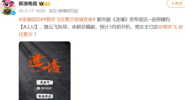 而且都市剧《迷墙》也官宣了,预计3月初开机。