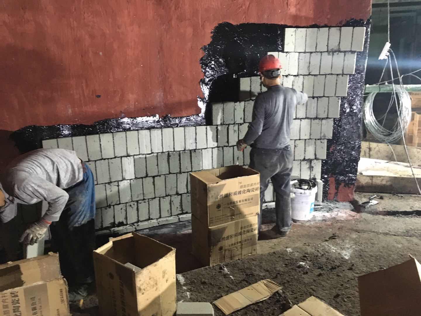 选用耐酸耐温玻璃砖,配套专用耐酸胶泥;铺贴采用错缝满浆工艺,胶泥涂抹厚度 8~10mm,玻璃砖按压密实,确保砖体与基面、砖体之间胶泥饱满,无空隙;铺贴顺直度、平整度实时校正,相邻砖缝宽度控制在 2~3mm,整体铺贴坡度与烟囱内壁一致,严禁通缝。