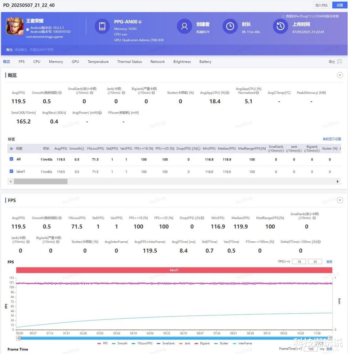 首先是一局《王者荣耀》,进入游戏先进入到设定页面分辨率、画质、帧率全部拉满,然后进行一局对战,使用PerfDog记录帧率曲线,平均帧率119.5FPS,全程无卡顿掉帧记录,帧率曲线稳如老狗,呈一条直线的状态,其实在这款游戏中,高帧率、直线、无掉帧,应该是一台旗舰机都应该有的素质。