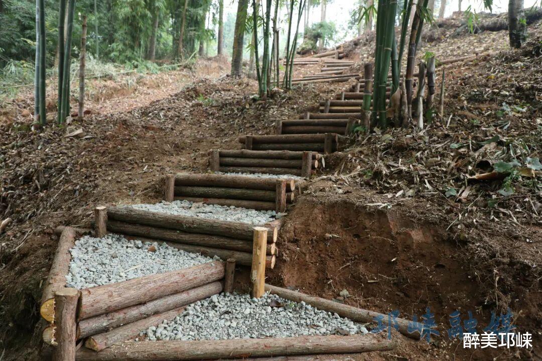 12月11日,在平乐镇花楸村的施工现场,这一理念得到了生动诠释。道路摒弃了水泥、钢板等现代材料,取而代之的是取自当地的原木与碎石。工人们将粗犷的原木巧妙嵌入山体,形成稳固的台阶,内部填充碎石保证排水与踏实感,开挖的坡面也尽量保持土壤原貌。这种建造方式使步道如同从山体中自然生长出来,实现了“虽由人作,宛自天开”的生态和谐。