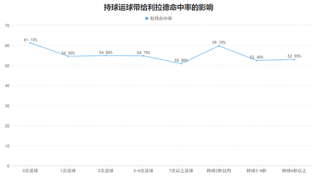 他的得分效率也不会受到持球时间运球次数的影响:无论采用何种方式完成出手,利拉德的运动战也就是有效命中率均达到了50%以上,并且他在持球运球的过程中还可以同时阅读对手的防守从而选择是否传球。
