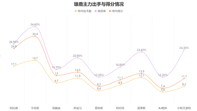 虽然利拉德加盟雄鹿已经两个赛季了,但本赛季却是字母哥与利拉德首次在季后赛并肩作战,在雄鹿9名主力中利拉德有着第二高的场均出手数与使用率,消耗的出手数与出手机会均位于主力第二意味着利拉德在雄鹿队内是稳稳的二号进攻核心,当然他也有着第二高的得分贡献,而他的作用也不仅仅是得分这么简单。