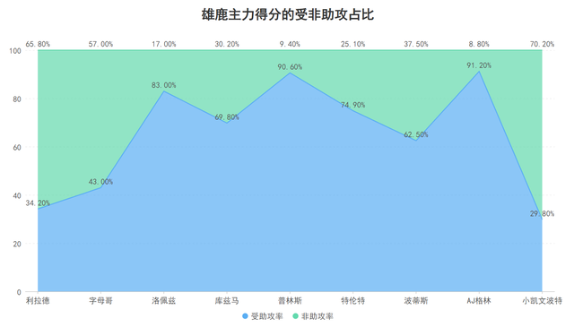 并且利拉德在雄鹿主力中拥有很高的得分非助攻率,这意味着当利拉德在场时雄鹿的进攻是这样的状态:利拉德负责外线持球阅读防守寻找得分与助攻的机会,当利拉德进攻不灵或者遭遇严防等情况时将球交给字母哥来处理,雄鹿的进攻体系也就是这样的双核驱动体系,小波特则是在利拉德不在场时充当利拉德的角色。