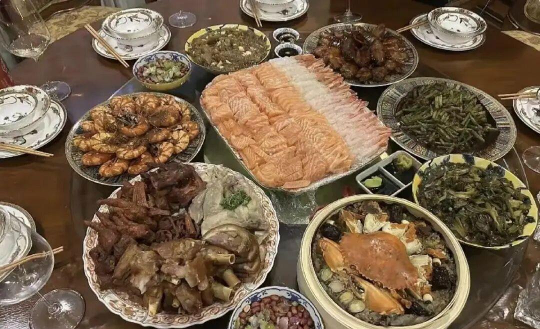聚餐上的菜肴摆得挺讲究,桌子上全都是高档的硬菜,气势十足。