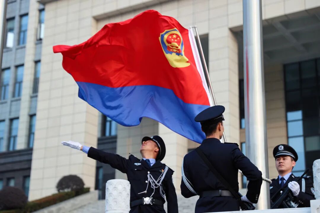 “迎警旗!”上午10时整,庄重的口令准时响起。仪仗队队员目光如炬、身姿挺拔,迈着铿锵有力的正步,庄严地将警旗护送至升旗台。随后,在激昂澎湃的《中国人民警察警歌》旋律中,全体人员肃立注目,鲜艳的警旗迎着晨光冉冉升起,格外夺目。