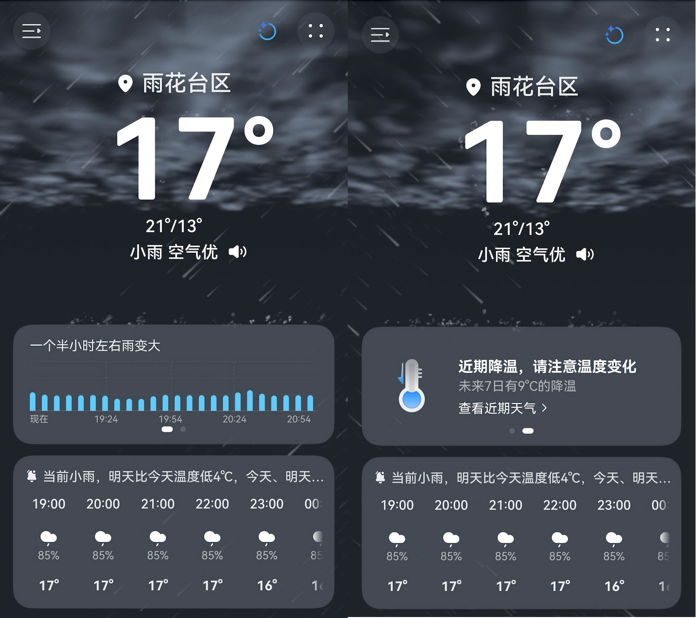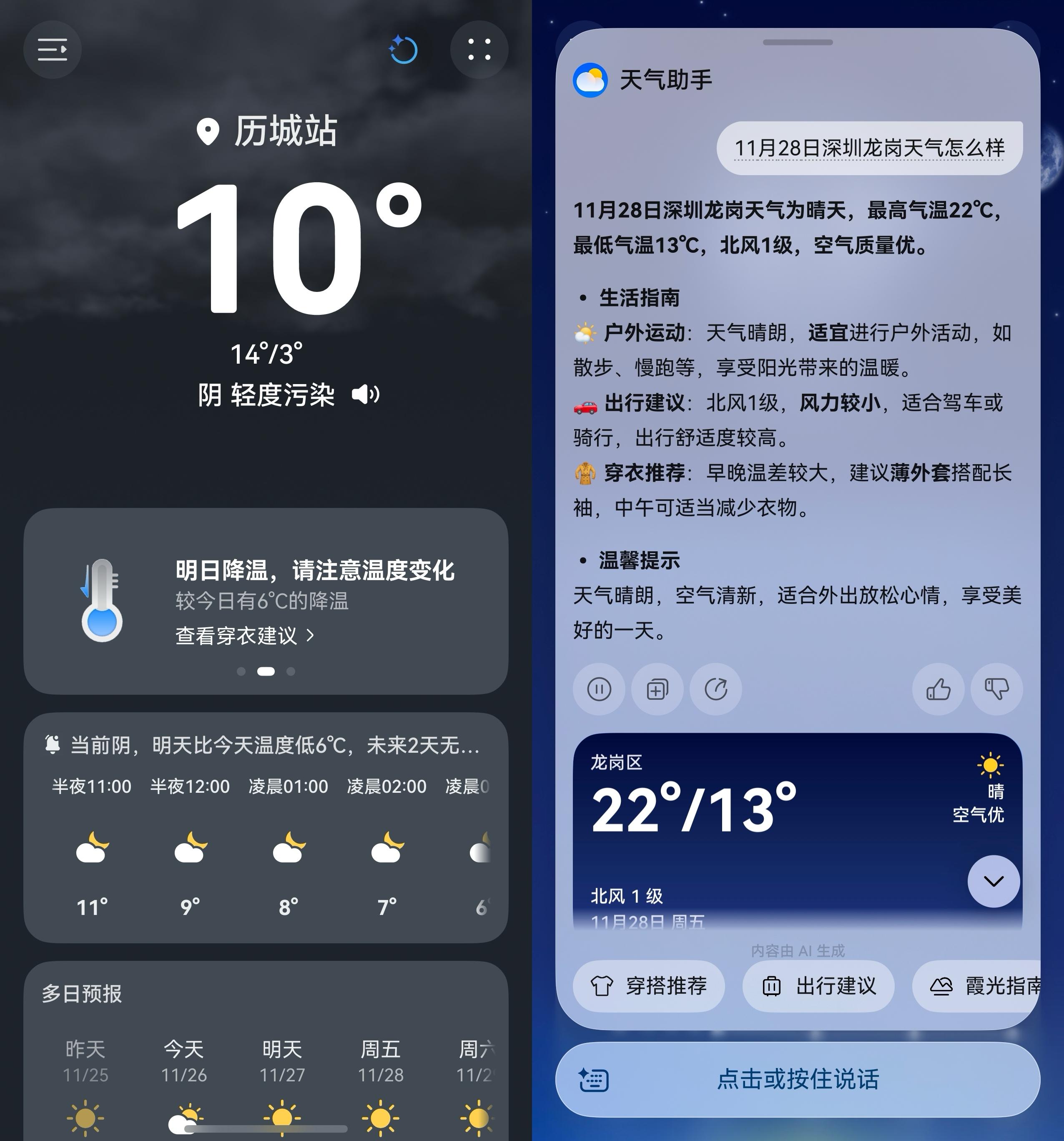 相信大多数人出远门都会有这样或那样的顾虑,到了目的地会不会突然降温?要不要带雨具?跨城出行怎么兼顾当前所在地和目的地天气?身为资深“花粉”,早就把11月28日深圳龙岗的鸿蒙星光之夜提上了日程,毕竟是第一次去深圳,对南方的天气心里也在打鼓,不知道怎么应对,没想到升级HarmonyOS 6之后,华为天气也变得更聪明了,直接帮我解决了不了天气难题,让我的出行准备简单多了。