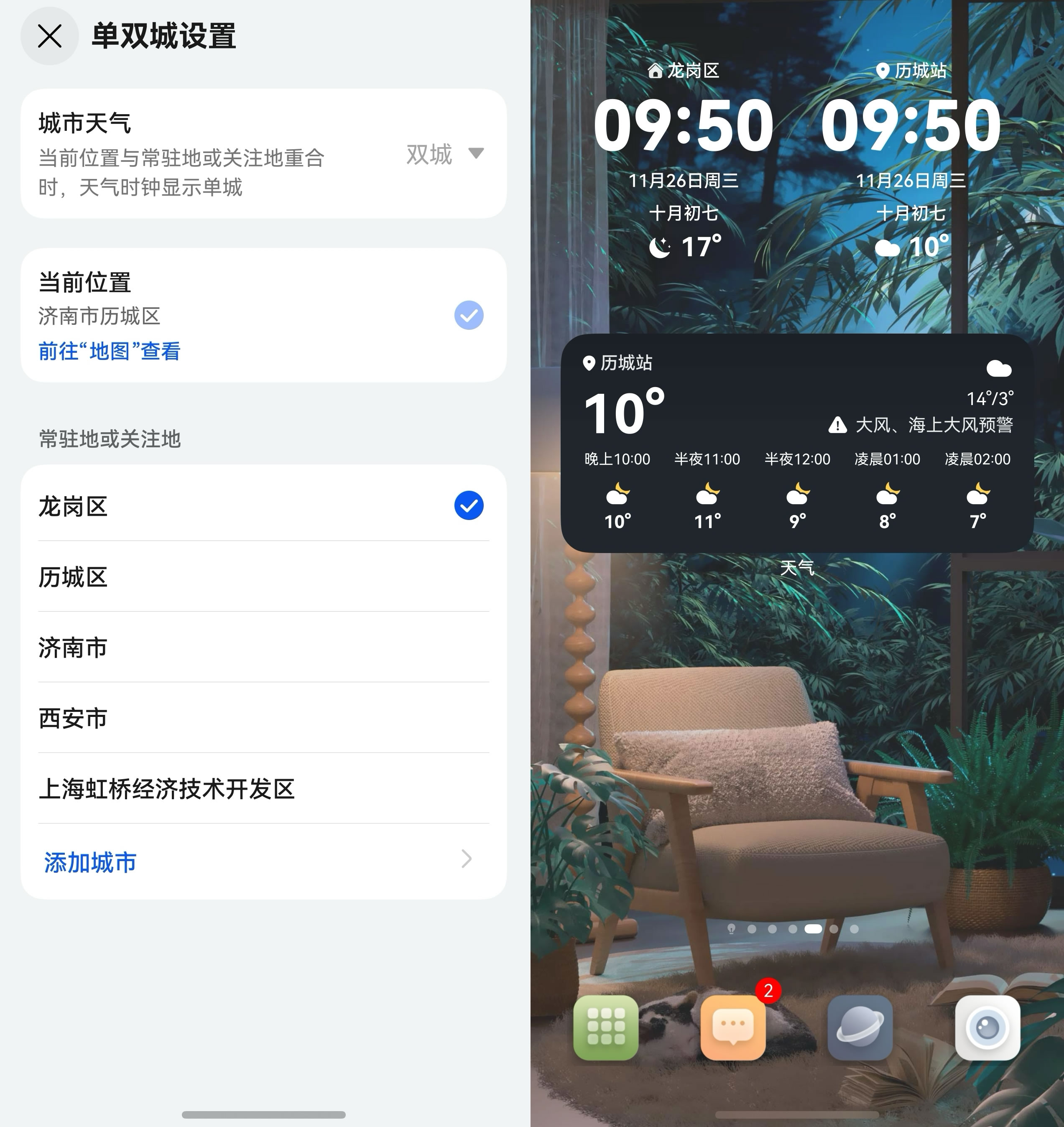 为了看天气更直观,我还设置了双城时钟天气,这样更方便直观地了解两城天气情况。设置起来也简单:长按天气App,选择“天气时钟”卡片;再长按桌面的天气时钟,选择“编辑”,把城市天气切换为“双城”,勾选深圳的龙岗区,一张能同时显示两地天气的桌面卡片就做好了。