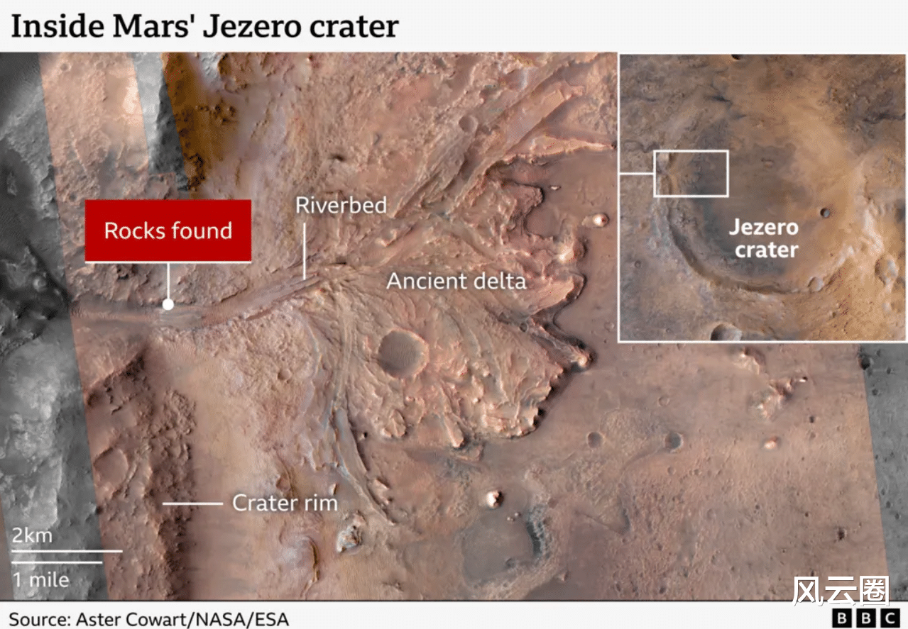 “毅力号”选择的探测点——杰泽罗陨石坑,在很久以前就是一个巨大的湖泊,有河流汇入。这正是寻找生命痕迹的绝佳地点。