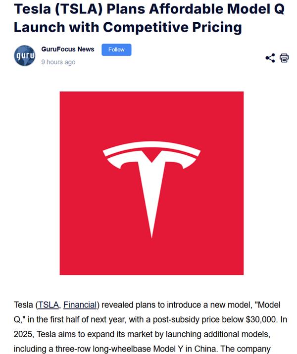 据报道,日前,在德银举办的特斯拉投资者关系负责人Travis Axelrod的投资者会议上,特斯拉方面表示,计划在明年上半年推出名为“Model Q”的新车型,补贴后价格低于30,000美元。