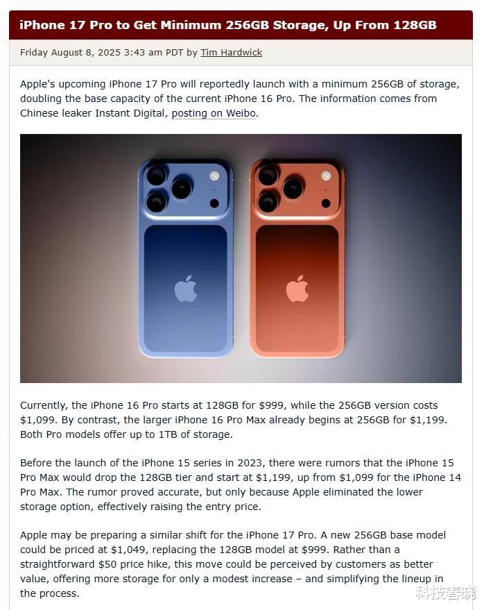 笔者认为,苹果将iPhone17 Pro的基准存储版本由128G提升到256G,跟“良心发现”没什么关系: