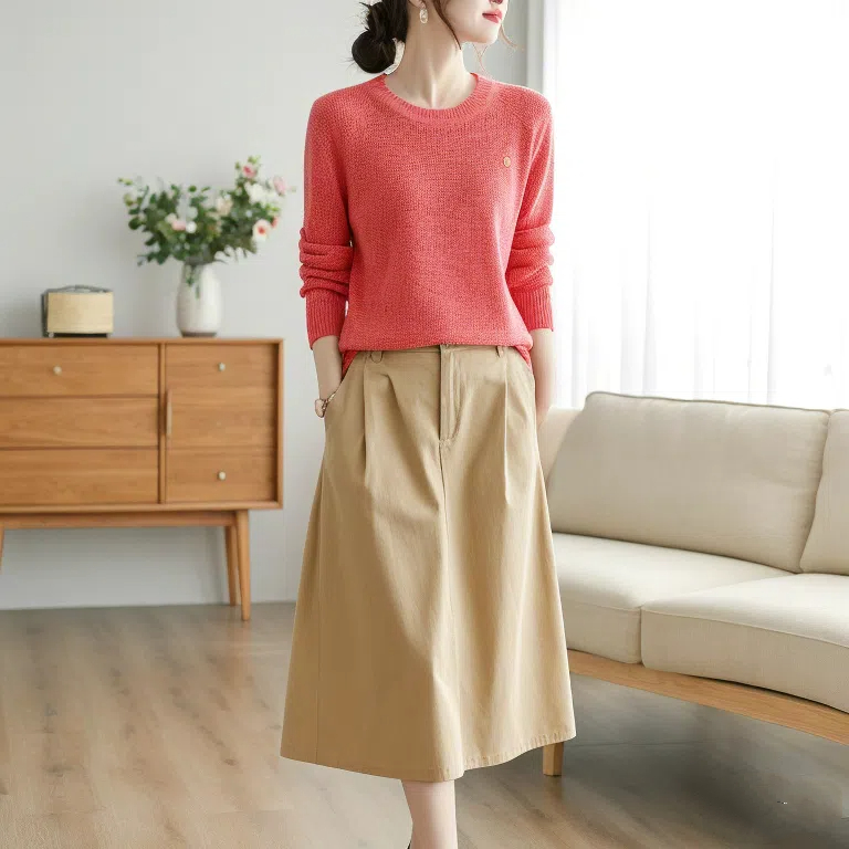 西瓜红与卡其色的半裙结合,构成了一对经典的配色组合。