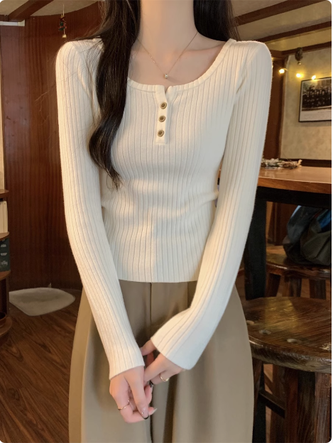它能纵向拉伸颈部线条,还能修饰脸型,特别适合脖子短和圆脸的姑娘。而且针织材质的V领上衣,不会显得过于性感。