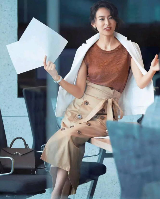 以下这套我尤为喜爱的搭配,深棕色针织背心与卡其色半裙相宜得彰,再套上洁白的西装,既显高雅又颇具知性气质。您尽可照搬此款造型。