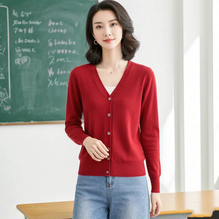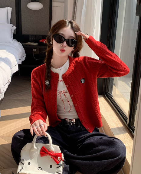 红色针织衫常为女性所青睐,然而其色彩鲜艳需搭配低调色调,如灰色。此款红衣袖口独特小褶皱颇具美感。