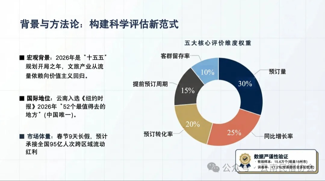 产业背景:2026年文旅产业从流量向价值回归,云南为2026《纽约时报》全球必去目的地,春节9天长假+95亿人次跨区域流动,成为全国民宿市场风向标。编制依据:紧扣《旅游民宿基本要求与等级划分》国标、云南民宿产业发展规划及协会40项团体标准规划。核心价值:为行业经营、游客旅居、品牌打造、平台搭建提供科学数据支撑,推动云南民宿高质量发展。数据基础:采样周期2025.12.1-2026.2.11,覆盖全省16州市128个民宿集群,有效样本15.6万个,异常数据识别误差率<1.2%。
