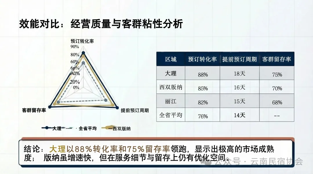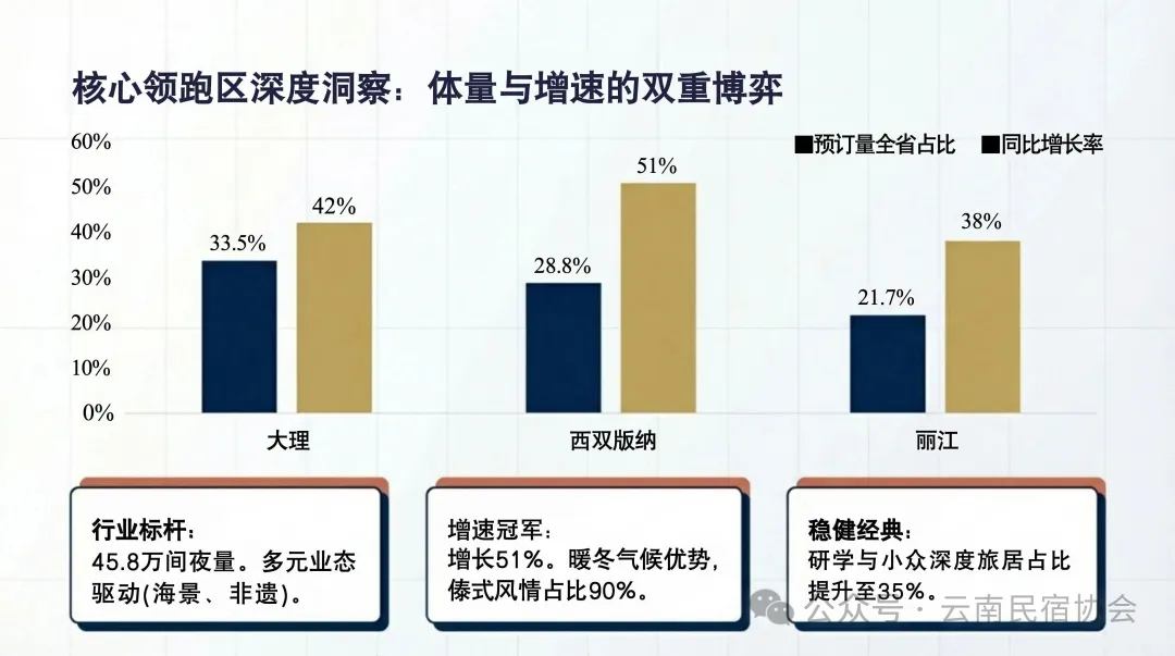 第一:大理白族自治州(96分)核心聚集区:大理古城、双廊、喜洲、沙溪等|预订量45.8万间/夜,占比33.5%|转化率88%|特色:非遗、海景、白族民居主题民宿,康养订单增55%第二:西双版纳傣族自治州(92分)核心聚集区:景洪、告庄西双景、勐海等|预订量39.2万间/夜,占比28.8%|增幅51%全省最高|特色:傣式风情民宿,康养旅居订单占32%第三:丽江市(89分)核心聚集区:丽江古城、束河、泸沽湖等|预订量29.6万间/夜,占比21.7%|研学客群占35%|特色:纳西族文化民宿,白沙文创民宿成新热点核心特征:三大区域预订量合计占全省84%,集聚效应显著,品牌化、规范化程度高。