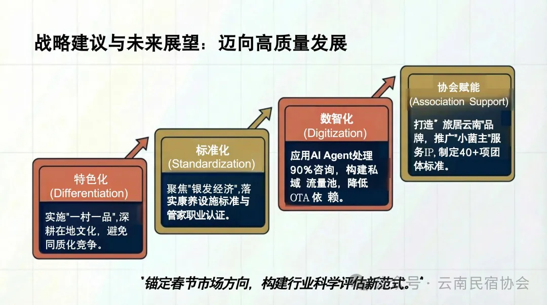 基于指数研究成果,为全省民宿从业者提供实操性发展建议:特色化打造:深挖在地文化,避免同质化,打造“一村一品、一店一特色”;康养赛道布局:依据康养旅居标准完善产品体系,加入协会钻级评价;数字化转型:依托协会智能体实现运营智能化,构建私域流量矩阵;人才职业化:参与管家等级认证培训,推动服务向“文化转译+情绪疗愈”升级。