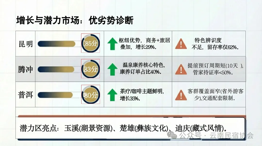 热门增长区(80≤得分<89)昆明市(85分):交通枢纽,商务+旅居双客群,同质化为主要短板腾冲市(83分):温泉康养民宿核心区,转化率80%,康养订单占40%普洱市(80分):茶主题民宿特色鲜明,茶疗康养订单占35%,省外客群占比偏低潜力发展区(70≤得分<80)玉溪市(78分):抚仙湖湖景资源独特,配套服务待完善楚雄彝族自治州(76分):彝族特色民宿,数据填报与提前预订周期为短板迪庆藏族自治州(74分):藏式民宿极具地域价值,冬季气候制约客流