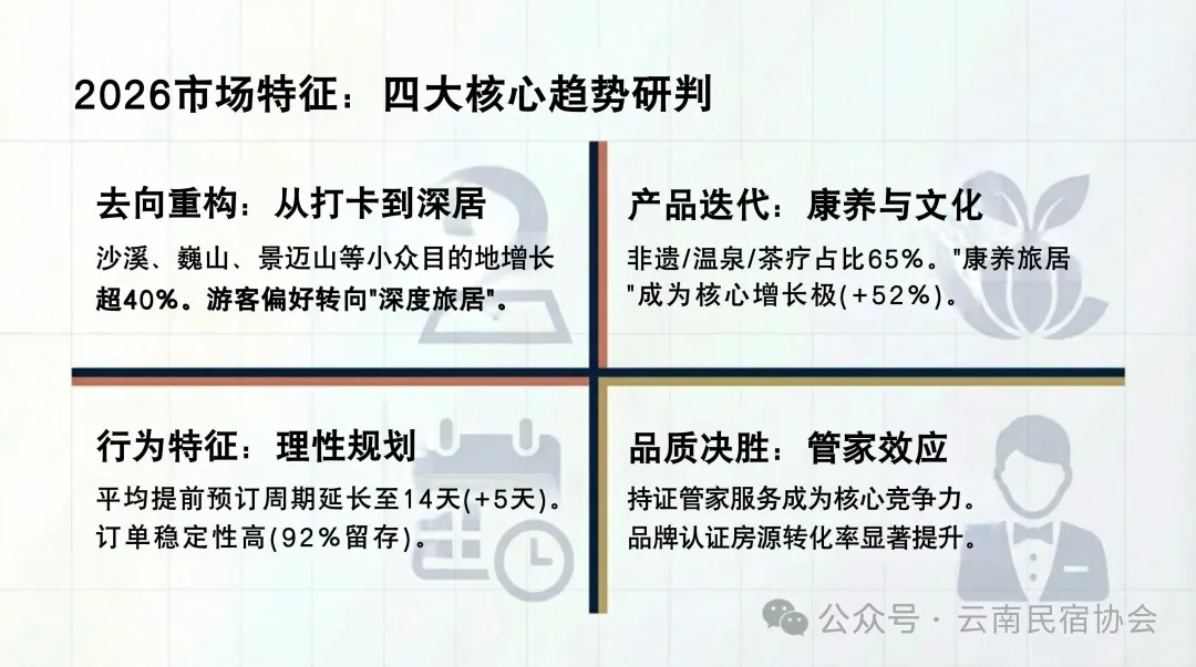 从指数数据提炼四大核心特征,锚定行业未来发展方向:核心目的地集聚效应显著,沙溪、景迈山等小众目的地潜力释放(增幅超40%);特色化/主题化民宿成主流,非遗、康养类产品预订量占比达65%;游客出行更理性,全省平均提前预订周期14天,订单留存率达92%;品牌化/规范化民宿优势凸显,持证管家覆盖率与经营效益正相关。