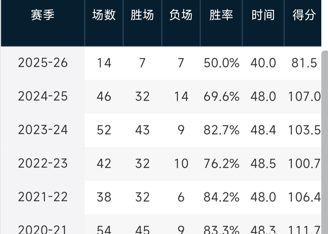 本赛季辽宁男篮的战绩下滑的很快,目前七胜七负排名联盟第11位,自从辽宁男篮拿到三连冠首冠的那个赛季开始,胜率从来掉下来六成。上赛季69.6%的胜率,已经是五年来的最低了,本赛季可能又要创新低,球队目前很困难,希望赵继伟的回归,能够让他们发生一些变化。