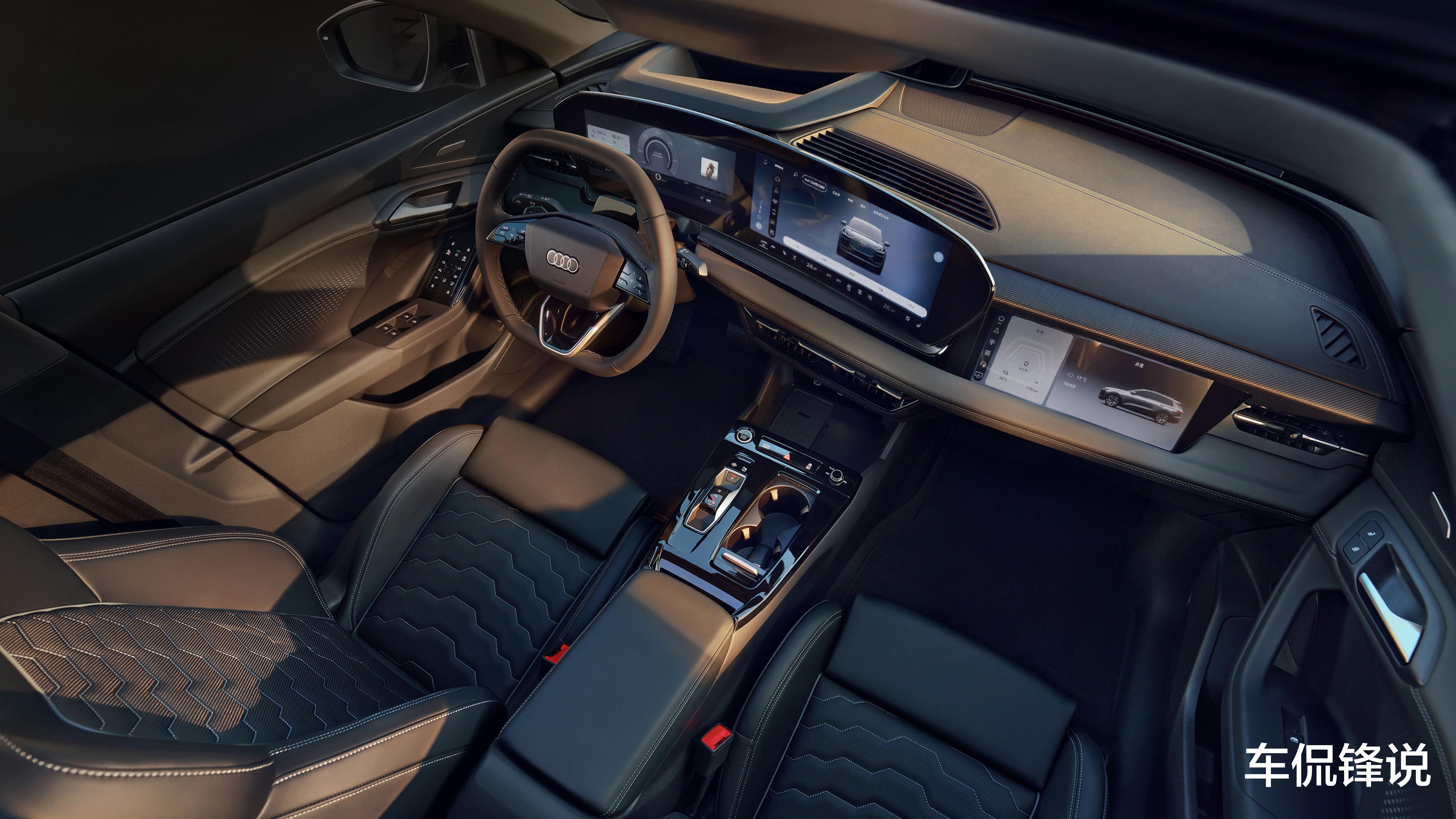 奥迪Q6L e-tron的内饰设计跟消费者常见的新能源汽车内饰不同,一上车,弧形的主驾+中控贯穿屏和副驾屏就足够抓人眼球,14.5英寸多媒体曲面屏、11.9英寸的虚拟座舱和10.9英寸的副驾驶屏幕就共同组成了车内的屏幕矩阵,再加上88英寸的AR-HUD,整个内饰的科技感强。