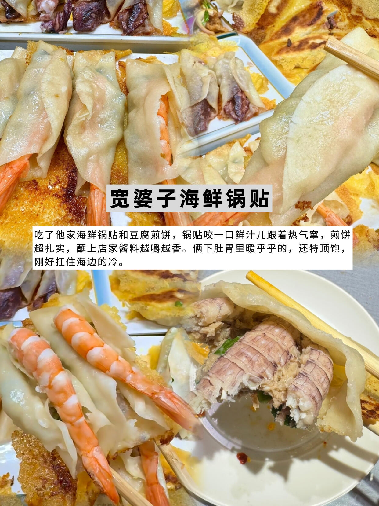 📍宽婆子海鲜锅贴:吃了他家海鲜锅贴和豆腐煎饼,锅贴咬一口鲜汁儿跟着热气窜,煎饼超扎实,蘸上店家酱料越嚼越香。俩下肚胃里暖乎乎的,还特顶饱,刚好扛住海边的冷。
