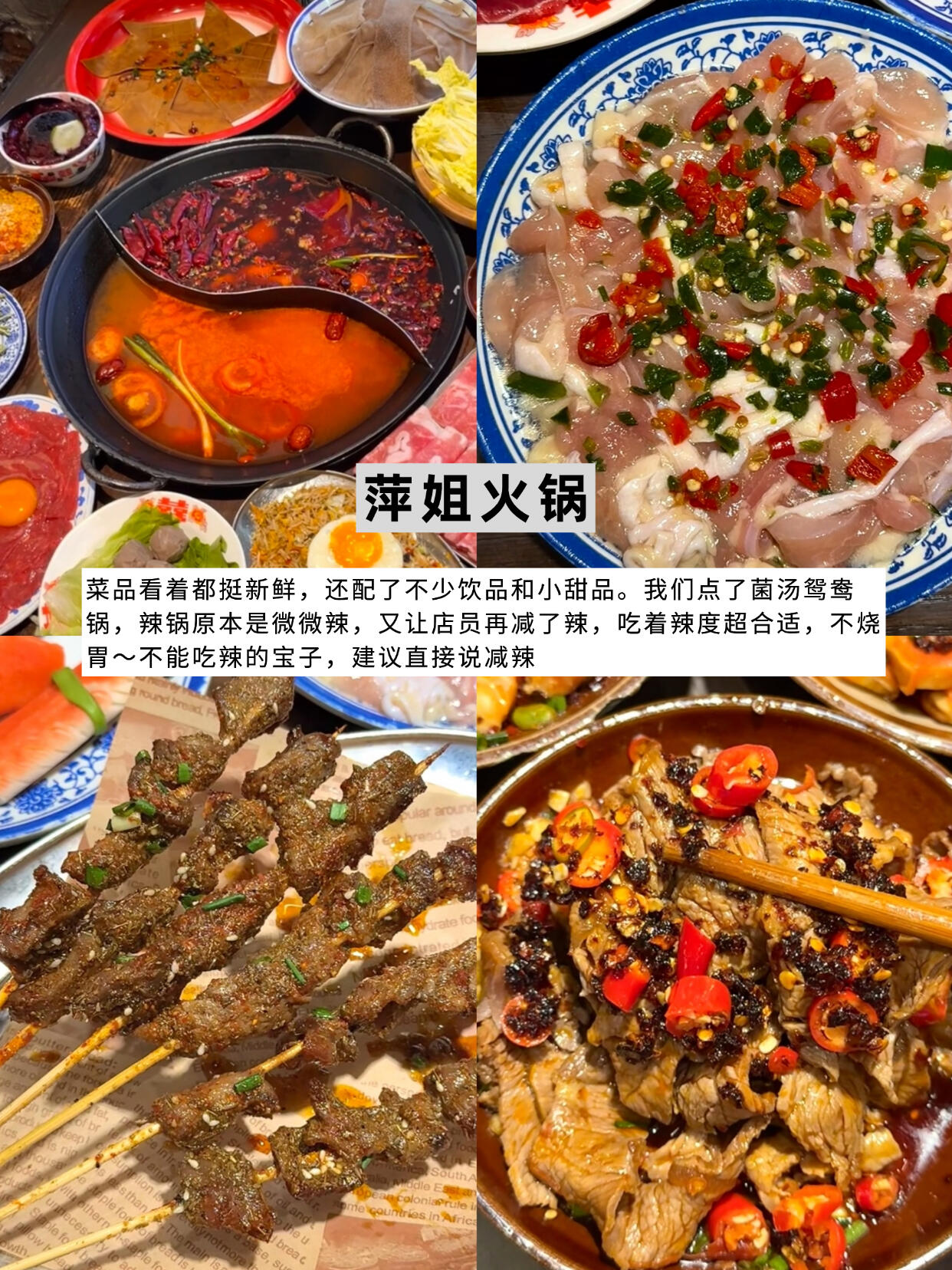 📍萍姐火锅:菜品看着都挺新鲜,还配了不少饮品和小甜品。我们点了菌汤鸳鸯锅,辣锅原本是微微辣,又让店员再减了辣,吃着辣度超合适,不烧胃~不能吃辣的宝子,建议直接说减辣