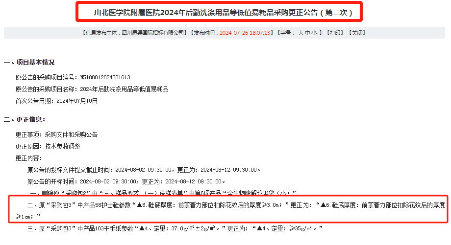 在招标公告发布2周后,即7月26日,该项目发布第二次更正公告称,原“采购包3”中产品58护士鞋参数,鞋底厚度:≥3.0m;更正为:≥1cm。