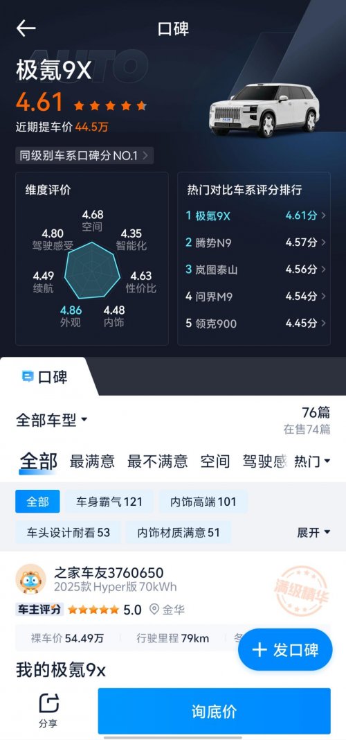极氪9X荣登汽车之家和懂车帝双榜首,这个成绩含金量极高,因为它代表了“大型SUV”这个细分市场中,用户对全能型产品的极度渴望。