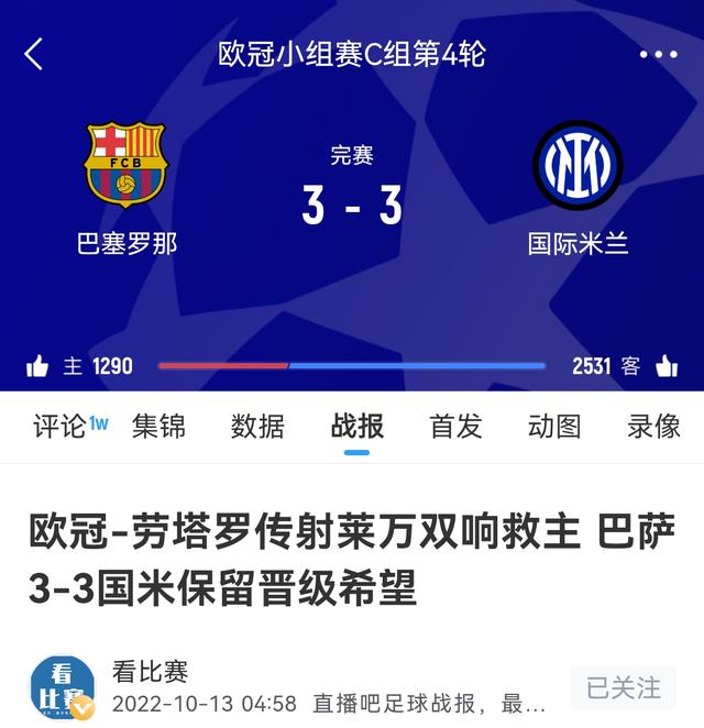 2022年10月13日欧冠小组赛第四轮,巴萨主场迎战国米。