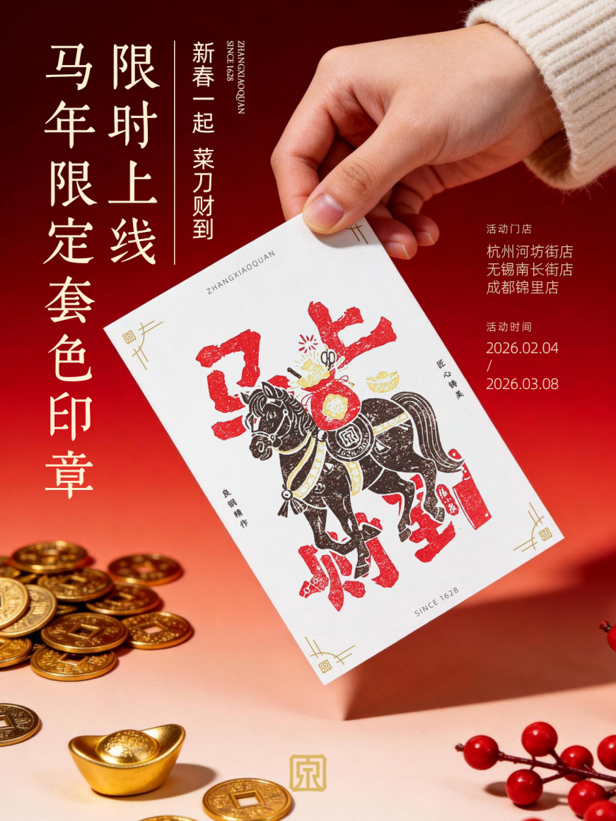 除了全新如意剪冰箱贴,张小泉同步上线马年限定套色印章,以“新春一起,菜刀财到”的吉祥寓意加码新春氛围,活动于2026年2月4日至3月8日,在杭州河坊街店、无锡南长街店、成都锦里店三大特色门店限时开启,为消费者带来沉浸式品牌互动体验。