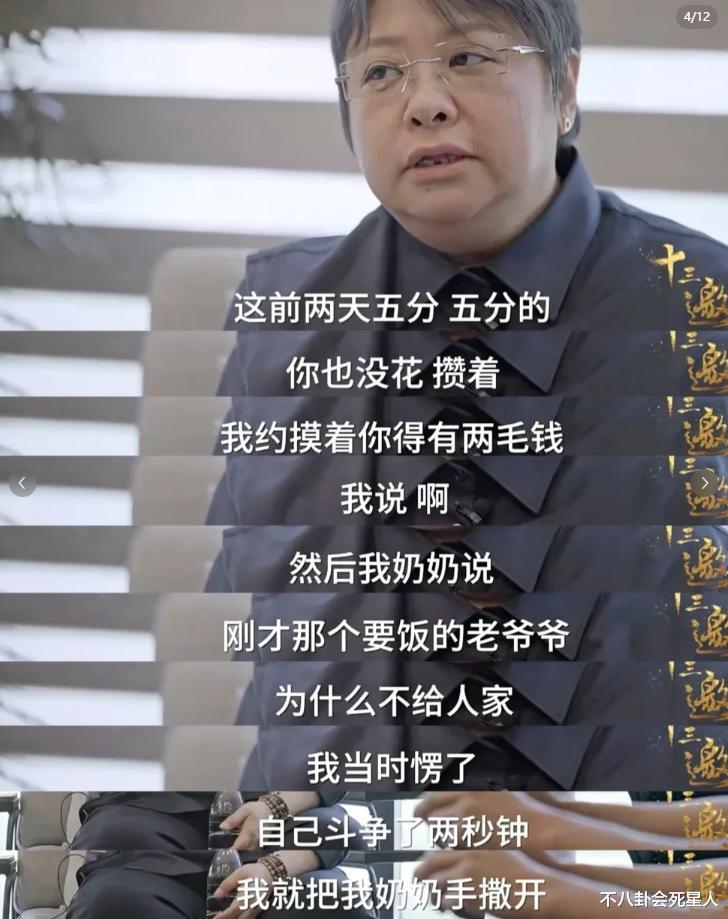 奶奶后面询问她是不是有2毛钱,为什么不给要饭的老头,韩红想了想,攥着这2毛钱恭恭敬敬的递到了要饭人的手里,看到这幅场景,奶奶朝她竖起了大拇指。