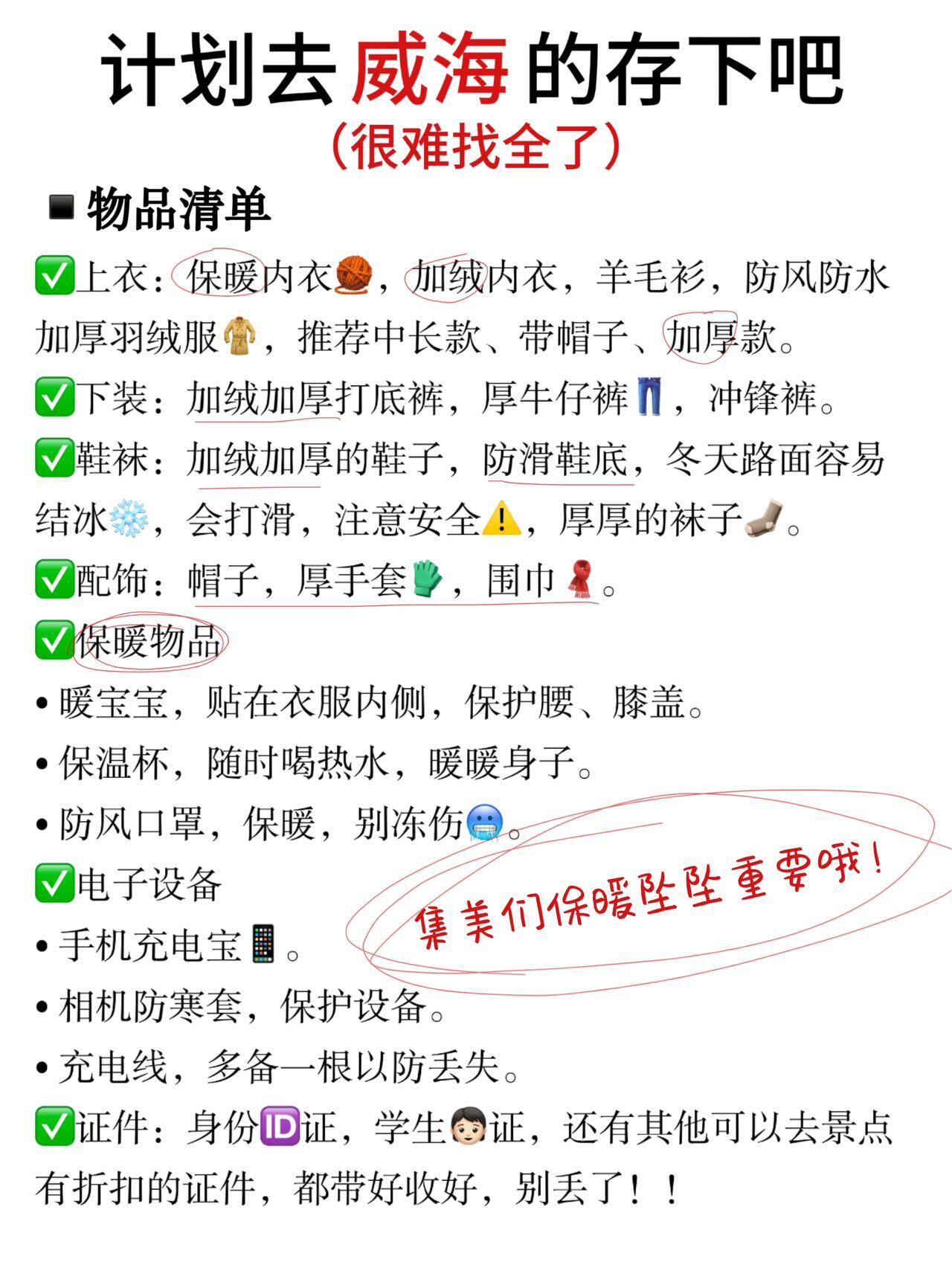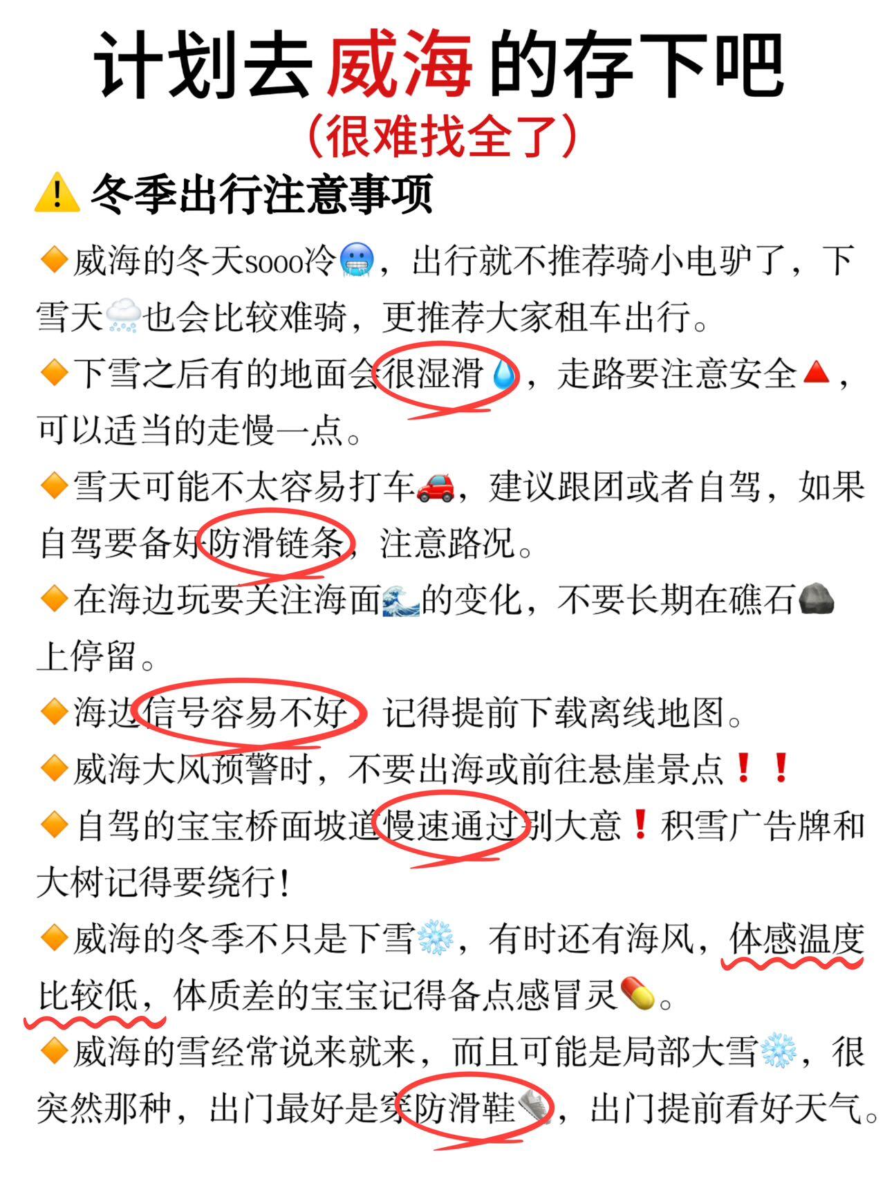 就两个字❗️保暖❗️,暖暖的才🈶好状态,才能拍📷美美的照片。威海冬季的海风,吹的人的生疼,而且体感温度比较低,体质差的宝宝记得备点感冒灵💊。如果遇到威海大风💨预警时,不要出海或前往悬崖景点!!🙅♂️自驾的宝宝桥面坡道慢速通过别大意❗️积雪广告牌🪧和大树🌳记得要绕行!!